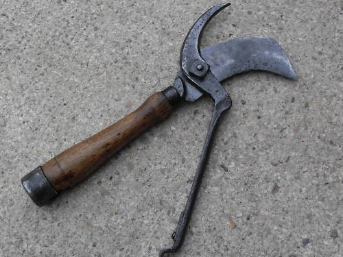 Vineyard Hook: Common in most wine producing countries, usually with a (long and often narrow) back blade used until the mid 19th century for pruning grape vines (usually in February or March). Widely replaced by the secateurs in most vineyards, it remained in use until the late 20th century in some regions of France, and some versions are still made (and presumably used) in Italy at the beginning of the 21st . It probably existed in England in medieval times, but disappeared when wine growing ceased.