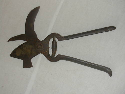a woody stem. Sometimes found with a shaft to the blade, similar to the gooseberry hook, or with a long extended handle. They were also made as a large pocket knife with a folding
